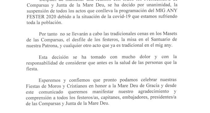 El acuerdo adoptado supone la suspensión de las tradicionales cenas en los “masets” de las comparsas, el desfile de los festeros y cualquier otro acto vinculado al “Mig Any Fester”. El concejal del área ha señalado que “la decisión se ha tomado con mucho dolor y con la responsabilidad de considerar que antes es la salud de las personas que la fiesta”.