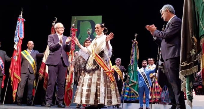 La Regidora Mayor, María Navarro, fue recibida en el escenario del Teatro Chapí por las 14 Madrinas y los Alféreces Mayores de las distintas comparsas de Moros y Cristianos, el alcalde en funciones, Javier Esquembre y el presidente de la Junta Central Fiestas, Luis Sirera al son del pasodoble La Entrada de Quintín Esquembre.