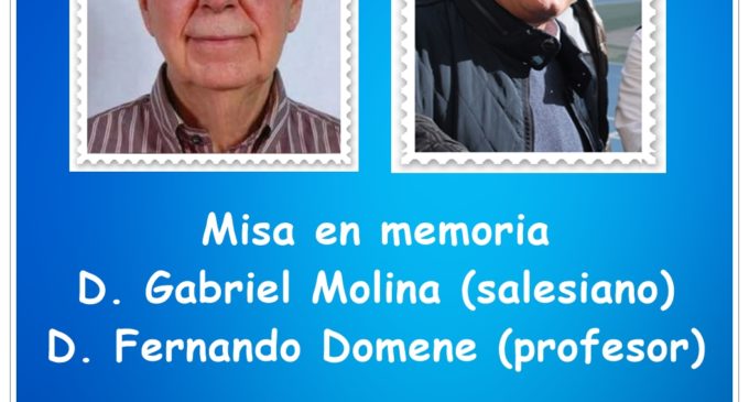 La Comunidad Salesiana de Villena, por medio de la promoción 1976-84, le invitan a la celebración de la Eucaristía en memoria del Salesiano D. Gabriel Molina (fallecido hace dos años) y del profesor D. Fernando Domene (fallecido hace justo un año).