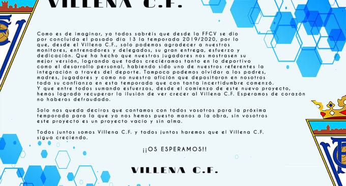 Como es de imaginar, ya todos sabréis que desde la Federación de Fútbol de la Comunidad Valenciana (FFCV) se dio por concluida, el pasado día 13 de mayo, la temporada 2019/2020, por lo que desde el Villena CF solo podemos agradecer a nuestros monitores, entrenadores y delegados , su gran entrega , esfuerzo y dedicación. Que ha hecho que nuestros jugadores nos mostrasen su mejor versión, logrando que todos creciéramos tanto en los deportivo como en el desarrollo personal, habiendo sido uno de nuestros referentes la integración a través del deporte. Tampoco podemos olvidar a los padres, madres, jugadores y como no nuestra afición que depositaron en nosotros toda su confianza en esta temporada que con tanta incertidumbre comenzó. Y que entre todos sumando esfuerzos, desde el comienzo de este nuevo proyecto, hemos logrado recuperar la ilusión de ver crecer al Villena CF. Esperamos de corazón no haberos defraudado.