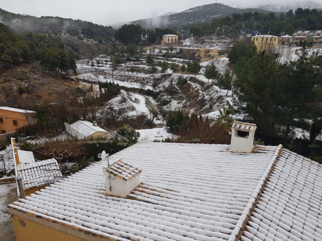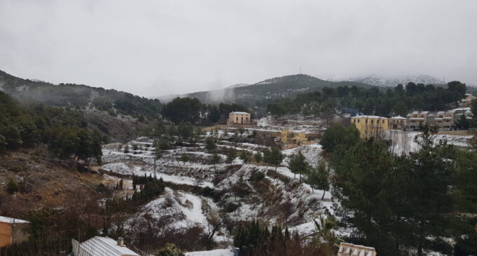 En la tarde de ayer cayeron los primeros copos pero la nieve no cuajó. Ha sido en la madrugada del jueves a viernes cuando los tejados del municipio se han cubierto de blanco. De momento se puede transitar por casi todas las carreteras de acceso a la población aunque se recomienda evitar el enlace con Castalla.