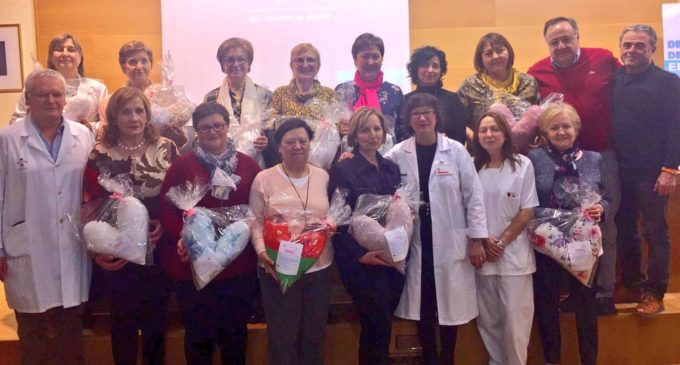 La Associació Dones de Biar, Consumidors i Usuaris ha entregado cerca de sesenta “almohadas del corazón” al Hospital General Universitario de Elda en un encuentro en el Salón de Actos celebrado en el día de ayer, coincidiendo con el Día contra el Cáncer . Una decena de mujeres de Biar fue recibida a las 17 horas por Vicenta Tortosa, Gerente del Departamento de Salud y el equipo directivo, junto con el cirujano y la enfermera de la Unidad de Patología Mamaria y la Vocal del Colegio de Enfermería de Alicante, Lola Gil.
