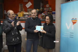 El presidente de la asociación de comerciantes, Jorge García, entregó el cheque solidario de 500 euros a la representante de la asociación El Rabalillo, Ana Sirera.
