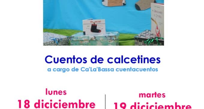 * Horas del cuento “ C uentos de calcetines” a cargo de Ca’La’Bassa cuentacuentos: Lunes 18 de diciembre, en la biblioteca Miguel Hernández, a las 6 h. de la tarde Martes 19 de diciembre, en la biblioteca La Paz, a las 6 h. de la tarde (destinado a niñ@s a partir de 2 años y entrada limitada al aforo del local)