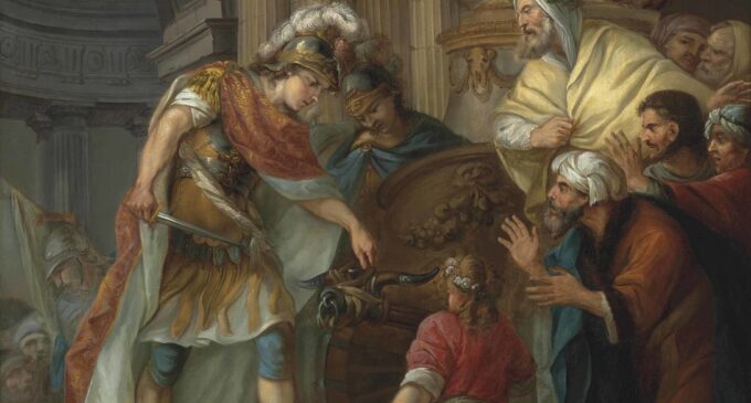 Cuando Alejandro Magno […] se dirigía a conquistar el Imperio persa, tras cruzar el Heloponeso, conquistó Frigia, donde le enfrentaron al reto de desatar el nudo. Solucionó el problema cortándolo con su espada, diciendo: «Es lo mismo cortarlo que desatarlo». Esa noche hubo una tormenta de rayos que simbolizó, según Alejandro, que Zeus estaba de acuerdo con la solución. […]