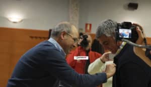 El alcalde de Villena, Javier Esquembre, tras felicitar a Luis Sirera por su elección y al resto de candidatura por su trabajo en pro de la fiesta, le impuso la insignia de la ciudad al nuevo presidente.