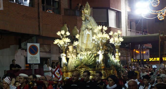 18.00 horas En el Altar Mayor de la Iglesia de Santiago. A continuación Procesión con la Imagen de la Virgen María de las Virtudes precedida por las comparsas. Una vez terminado el paseo, se realizarán disparos de arcabucería y se rodarán las banderas. A continuación Solemne Procesión con la sagrada imagen de la Virgen María de las Virtudes precedida por todas las comparsas