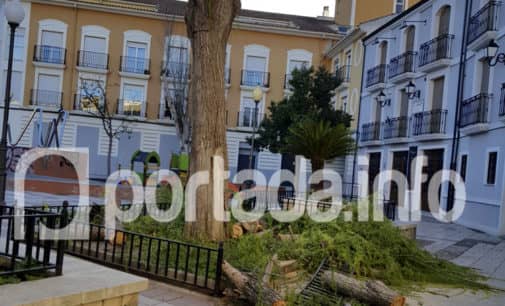 El departamento de Parques y Jardines ha procedido hoy al saneamiento de un ejemplar de falsa pimienta que presentaba, según los informes técnicos, un riesgo inminente de rotura y desprendimiento