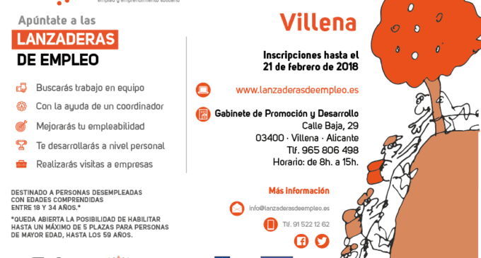 El próximo 21 de febrero finaliza el plazo para que las personas desempleadas de Villena puedan apuntarse a la nueva Lanzadera de Empleo la cual servirá para ayudar a 20 personas desempleadas a optimizar su búsqueda de trabajo y contar con nuevas posibilidades de inserción laboral.