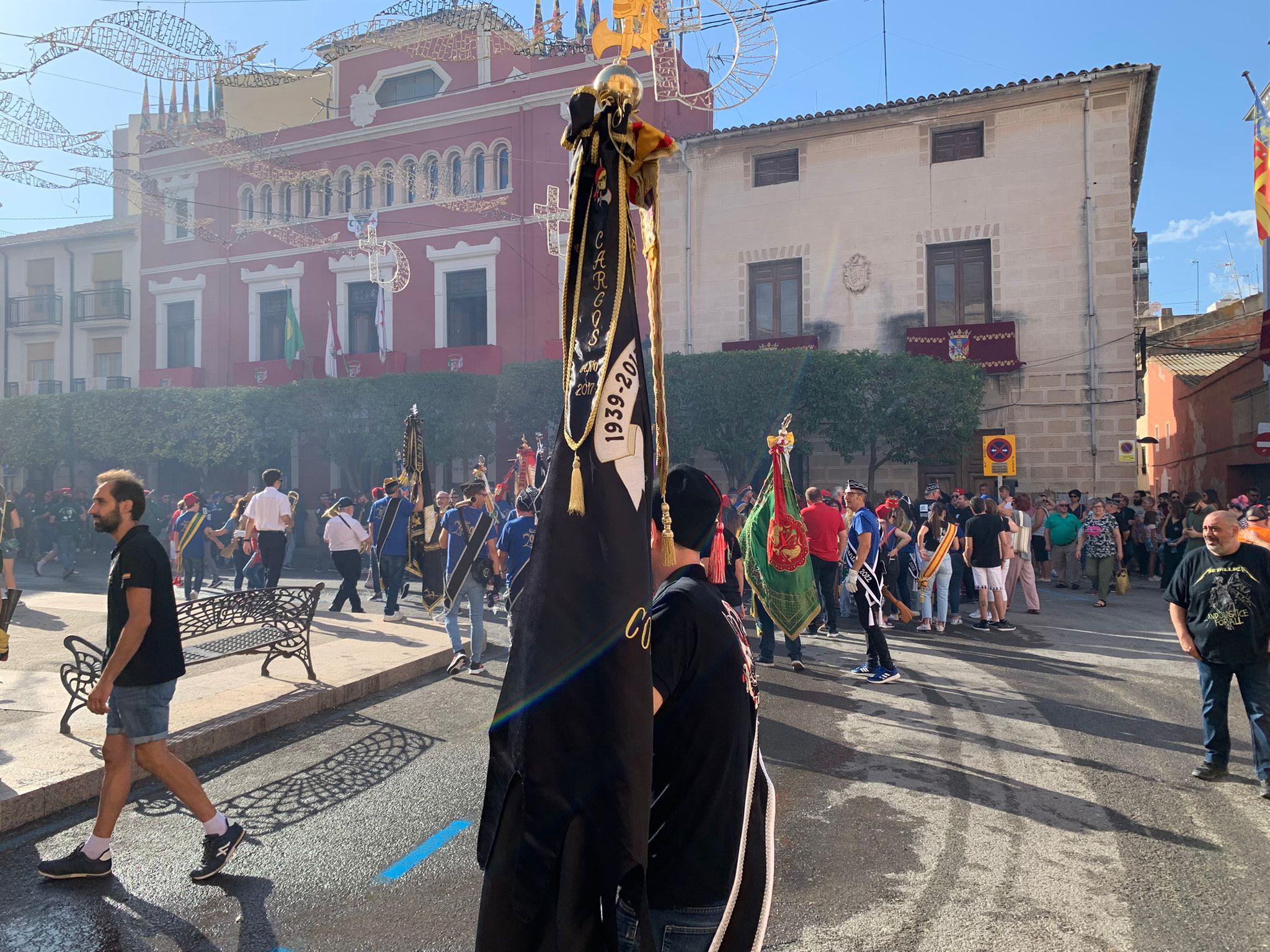 Con emoción contenida, antes del inicio del acto de pasacalles, la Junta Central de Fiestas ha realizado un homenaje en memoria de los fallecidos en los últimos dos años, es decir durante la pandemia por la Covid-19.En las escaleras de la iglesia de Santiago los 14 Alféreces de las comparsas escoltaban el estandarte de Nuestra Señora de las Virtudes y alrededor de la plaza los Capitanes han disparado 14 tiros de arcabucería. Después unas palabras de recordatorio y cerrando el acto el sonido de una trompeta acompañada de la Banda Municipal ha emocionado a todos los asistentes.