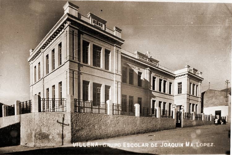 Debido a la deficitaria situación de los puestos escolares en Villena, y según datan las actas municipales , es en 1929 , cuando se aprueba la construcción de una escuela graduada de cuatro secciones que se emplazará en la Plaza de la calle Rodríguez. Esta escuela en principio de cuatro secciones, dos de niñas y dos de niños, pasaría a seis debido al número de escolares de ambos sexos existentes de la zona, motivo que atrasó a la finalización de la obra. Fue en 1933 cuando se da por terminada y es inaugurada el 8 de septiembre de ese mismo año a las 9 de la mañana con el nombre de ” Joaquín Mª López”.