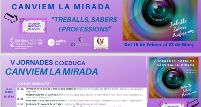 Villena ha abierto el plazo de inscripción gratuita al público general para las V Jornadas Comarcales de Coeducación ‘Canvíem la mirada’, organizada por el CEFIRE de Elda en colaboración con los municipios de Villena, Petrer, Pinoso, Monóvar, Elda y Novelda, a través de sus respectivas concejalías de Igualdad. La jornada será abierta con la intervención del director del CEFIRE de Elda, Paül Limorti y la concejala de Igualdad de Villena, Alba Laserna, previa a la presentación de la misma a cargo de la agente de Igualdad del Ayuntamiento de Villena, Mari Cruz Pla.