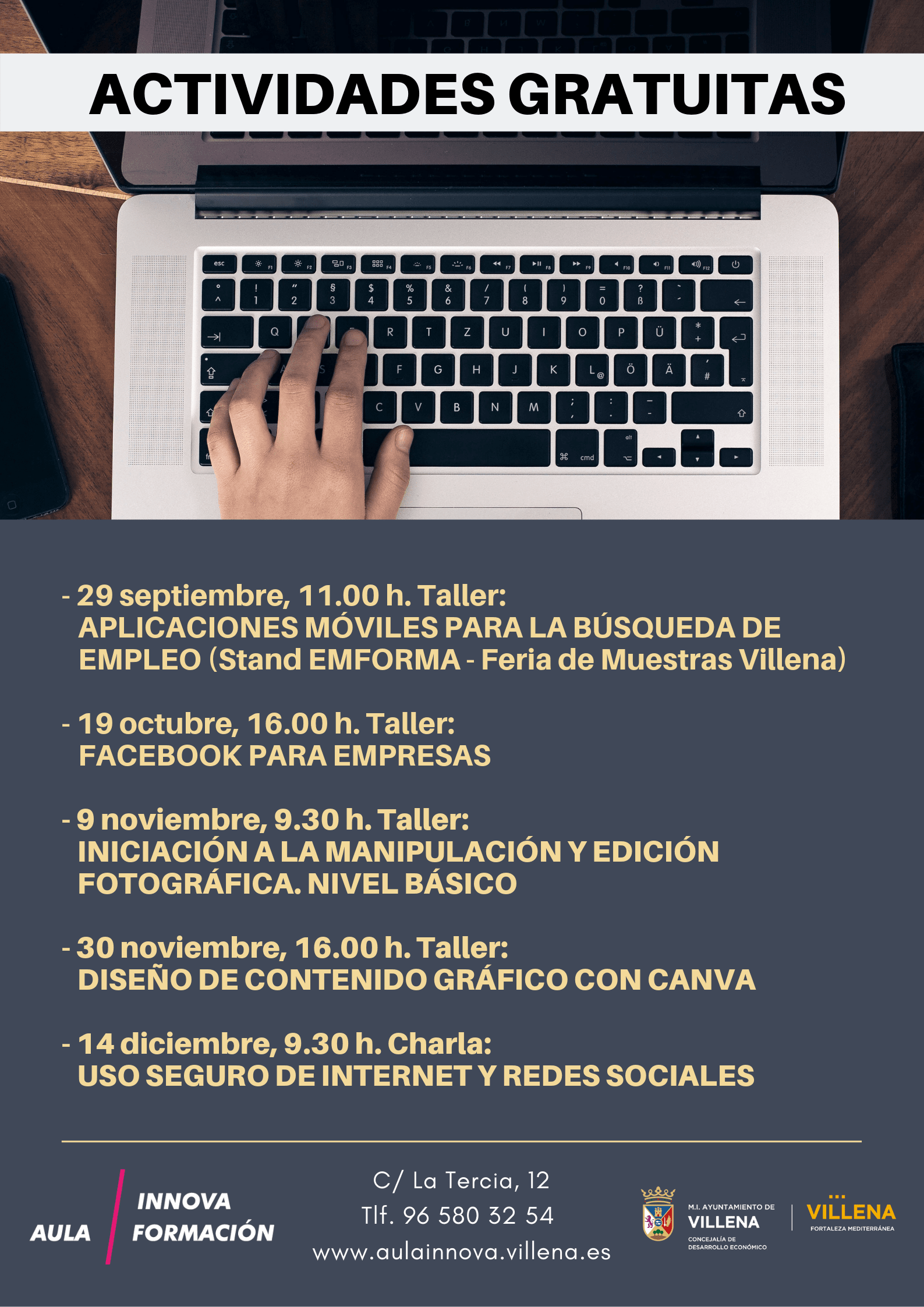 Desde la Concejalía de Desarrollo Económico del Ayuntamiento de Villena se informa que ya está abierto el plazo de inscripción en los talleres gratuitos que Aula Innova Formación ha programado para este último trimestre del año. Se trata en todos los casos de talleres prácticos, de corta duración y de temáticas muy diversas, que pretenden dar a conocer a los participantes herramientas online muy prácticas e interesantes: