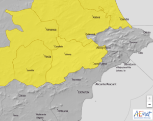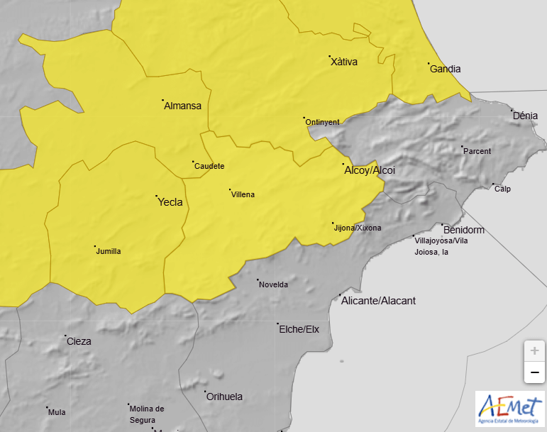 Este aviso se extiende a todo el interior de la provincia de Alicante, que cubre las comarcas del Alto Vinalopó, se extiende a la Foia de Castalla y El Comtat, así como a la zona norte de la comarca de L’Alacantí, sobre todo en el término municipal de Xixona. Esta situación hace que el Ayuntamiento envíe un mensaje de aviso a la ciudadanía ante posibles desplazamientos en carretera durante la jornada de mañana por la tarde en esta zona señalada por la AEMET.