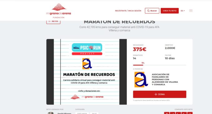 AFA ha organizado un maratón de recuerdos, una carrera solidaria virtual apra conseguir material anti Covid-19 para la asociación de Familiares de Enfermos de Alzheimer de Villena y Comarca. El reto es correr 42,195 kilómetros del 18 al 31 de diciembre en la localidad en una única carrera o repartida en diferetnes entremaientos.
