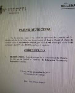 Finalmente, el alcalde de Villena ha convocado un Pleno Extraordinario para la concesión de la Medalla de Oro de la Ciudad al IES Hermanos Amorós, que tendrá lugar en el Teatro Chapí el jueves 9 de noviembre a las 20 horas, en lugar de a las 20.30 como se indicaba en un primer momento.