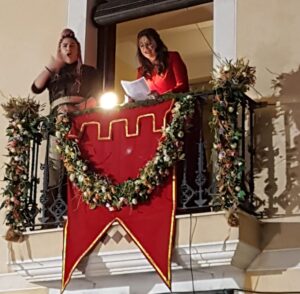 No puedo sentirme más feliz y orgullosa de estar aquí, en este balcón, rodeada de amigos; y que me ofrezcan la oportunidad de encender la mecha y dar por iniciadas las Fiestas del Medievo. Os deseo que disfrutéis de buenas viandas, jarras de vino y cerveza; que disfrutéis del ruido y de los cánticos, que bailéis por la calle. Seguro que aparecerá un juglar o un bufón que os hará bailar, cantar y reír… Que suenen nuestras risas, que la alegría brote a raudales, porque empiezan las Fiestas del Medievo.