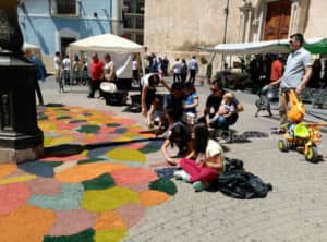Una de las novedades más llamativas de esta edición fue la creación de un tapiz floral en el centro de la plaza a cargo de voluntarios de la asociación Artekarana y los niños y niñas que participaron. “Los más pequeños se volcaron con esta actividad y hubo que ampliar el diseño original del tapiz varias veces”, ha indicado la concejala de Casco Histórico, Mari Carmen García. El tapiz se dibujó a base de serrín coloreado con pintura al agua.