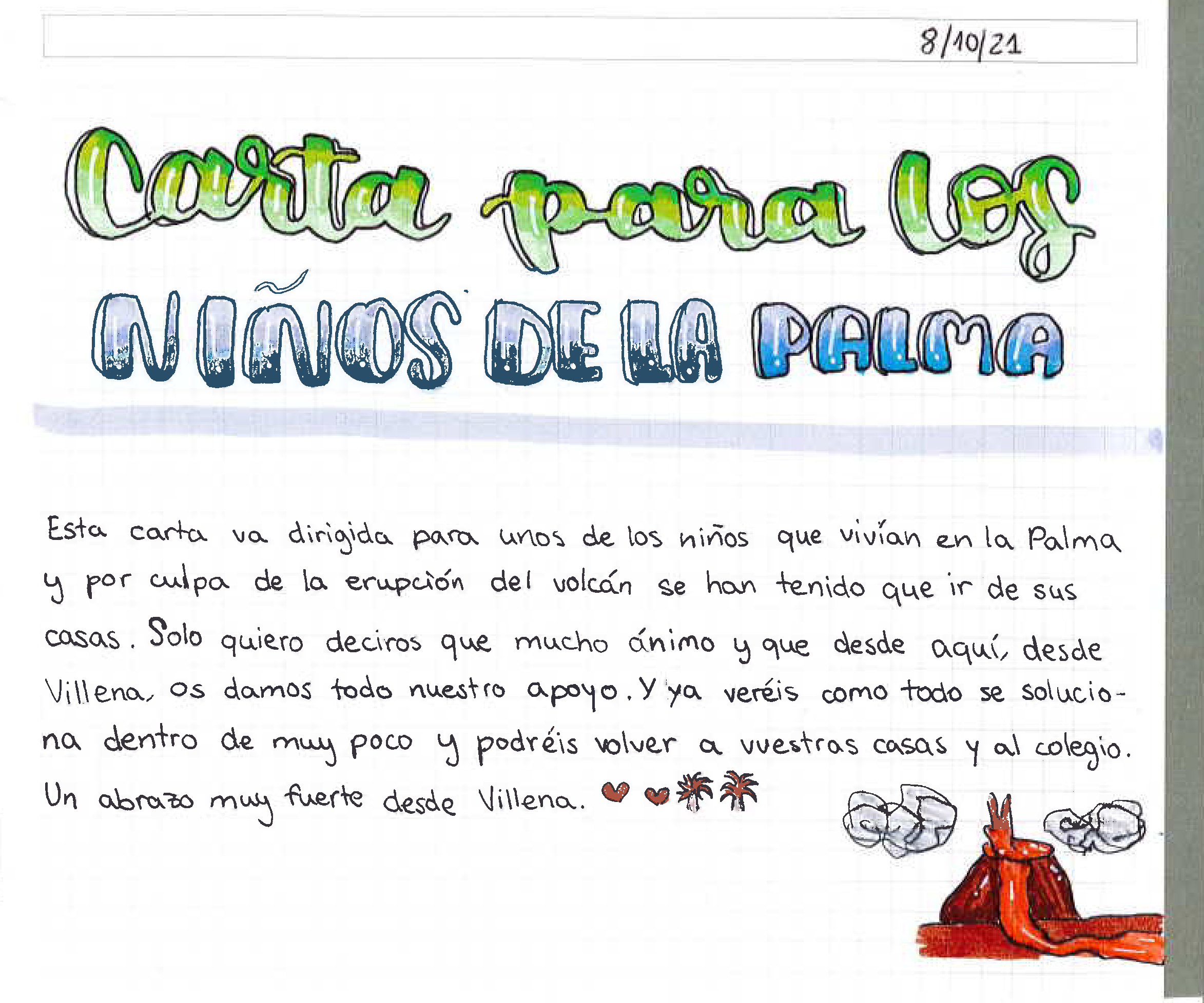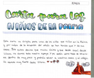 Los alumnos de valores éticos de 1º de ESO del IES Navarro Santafé han querido mostrar su solidaridad y empatía con sus compañeras y compañeros de La Palma enviándoles unas cartas ánimo que ya han llegado a sus destinatarios.