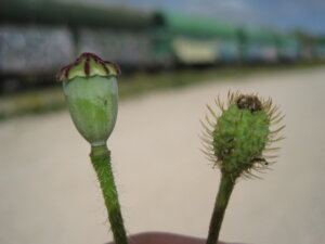 No tan común como sus parientes rojas, también podemos ver una amapola morada, del género Roemeria, Roemeria hybrida (L.) DC. Y por último también se ha visto por Villena la reina de las amapolas, una planta elevada, de un verde glauco, con pétalos que pueden ir del blanco al rosa intenso: la adormidera u opio, Papaver somniferum. Especie muy ligada a la medicina por su alto contenido en alcaloides, que se concentran en el látex de sus cápsulas semimaduras. De ahí se obtiene el opio y derivados como morfina, codeína, heroína, y la vicodina, que tomaba el Dr. House. También están los opiáceos sintéticos como el fentanilo, que está haciendo estragos en EE. UU. Es fácil de ver sus semillas —que no contienen alcaloides— que se utilizan para panes, tartas y como alimento para pájaros.