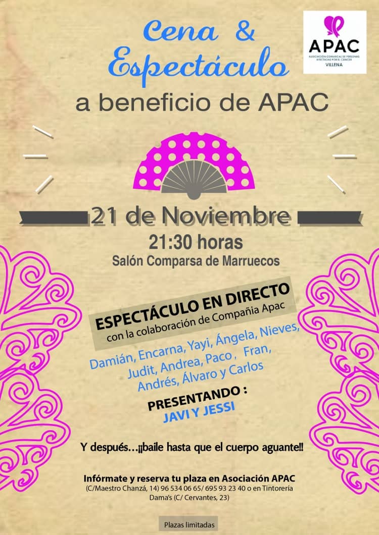 El próximo día 21 de Noviembre, la Asociación comarcal de Personas Afectadas por el Cáncer ofrece a todo el público una cena-espectáculo en la que, directivos, técnicos, voluntarios, afectados, socios,colaboradores..participan para que la recaudación sea la mayor posible y seguir alcanzando objetivos como asociación.