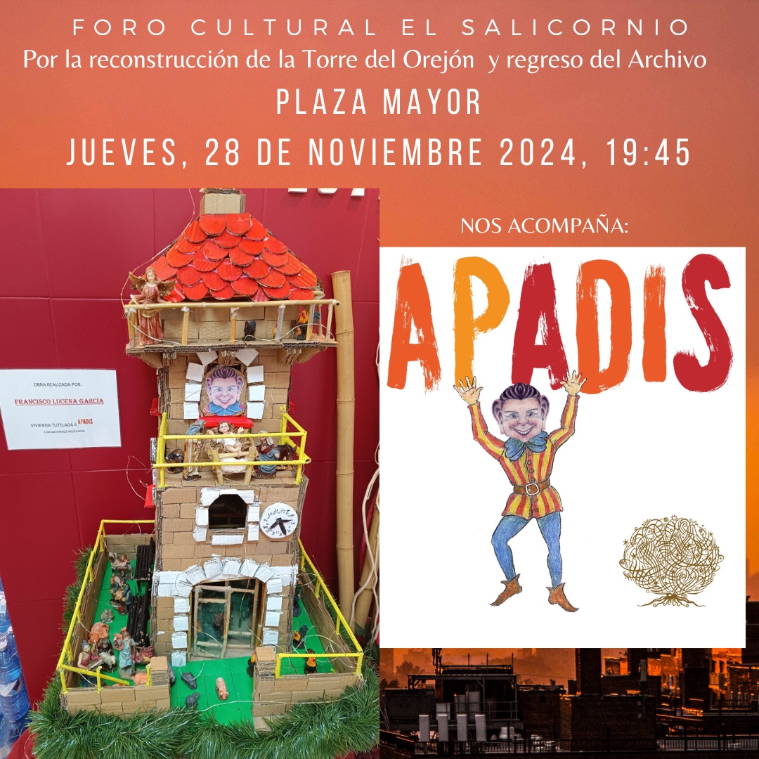 Os invitamos al encuentro festivo popular para reivindicar al Ayuntamiento la construcción de la torre con su Orejón, y que vuelva el Archivo Municipal.  Contamos también con una asociación modélica de Villena, APADIS.  No te lo puedes perder.  Un minuto de tu tiempo es un granito de arena para elevar la torre y que de nuevo el Orejón se asome a su plaza.