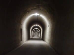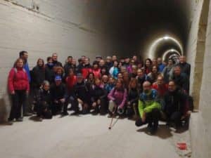 El autobús nos dejó en la antigua carretera de Alcoi a Alicante, junto al barranco de la Batalla., al comienzo de los túneles de la autovía, desde donde accedimos a la vía del tren, comienzo de nuestra ruta. La mañana se presentó fría, como anunciaban todos los pronósticos, pero caldeada con el ánimo que teníamos los participantes. En seguida nos encontramos con el primer túnel de casi 1 km. de longitud y perfectamente iluminado, después el viaducto de Sant Antoni, para llegar a un segundo túnel de una longitud similar al anterior. Animados porque la ruta era a la vez sencilla pero entretenida y variada llegamos a un tercer túnel y después al polideportivo, donde realizamos una parada para reponer fuerzas y almorzar. En este momento el fresquito nos dió una tregua, el sol brillaba y la temperatura era mucho más agradable.