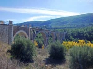 Reanudamos la marcha y pasamos por varios túneles llegando por fin al impresionante viaducto de las Siete lunas, sobre el rio Polop, de 230 m. de longitud y 46 metros de altura, que ofrece unas impresionantes vistas sobre la ciudad de Alcoi, el parque natural de la Font Roja y el parque natural de Mariola y que dadas las fechas, sobre el valle del río, los amarillos otoñales de los chopos contrastaban con el verde de los pinos creando un bonito paisaje otoñal.