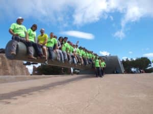 Después, cogimos de nuevo el autobús para desplazarnos al inicio de la ruta de Batería de Cenizas (305 m. de altitud), situado dentro de un parque natural muy cerca de la bahía de Portman, área de gran valor ecológico. En la cima del monte de Cenizas en 1934 se construyeron unas baterías, como parte del plan de defensa de 1923 del gobierno de Primo de Ribera, con la misión de proteger la base naval de Cartagena. Aún se conservan sus instalaciones militares (en ruinas) y dos impresionantes cañones Vickers construidos de acero, de 381 mm de calibre, 18 metros de longitud, un peso de 88 toneladas y un alcance de 35 km. El sendero que nos conduce al mirador de Cenizas transcurre entre un denso pinar, lo que propicia la actividad de senderismo en un día caluroso. Al final del sendero, pasando bajo una monumental portada de hormigón inspirada en el templo de los Guerreros blancos de las ruinas de Chichen-Itzá de estilo Maya-Tolteca se accede a una explanada donde se ubican los cañones, así como a sus distintos miradores, desde donde se tiene unas vistas del paisaje costeros espectaculares, de la bahía de Portman, el mar Menor y toda la costa de Calblanque. En este magnífico lugar, aprovechamos para realizar la parada del almuerzo, contemplando la costa y conversando con nuestros anfitriones que nos informan sobre todos los lugares de interes que tenemos ante nuestros ojos.