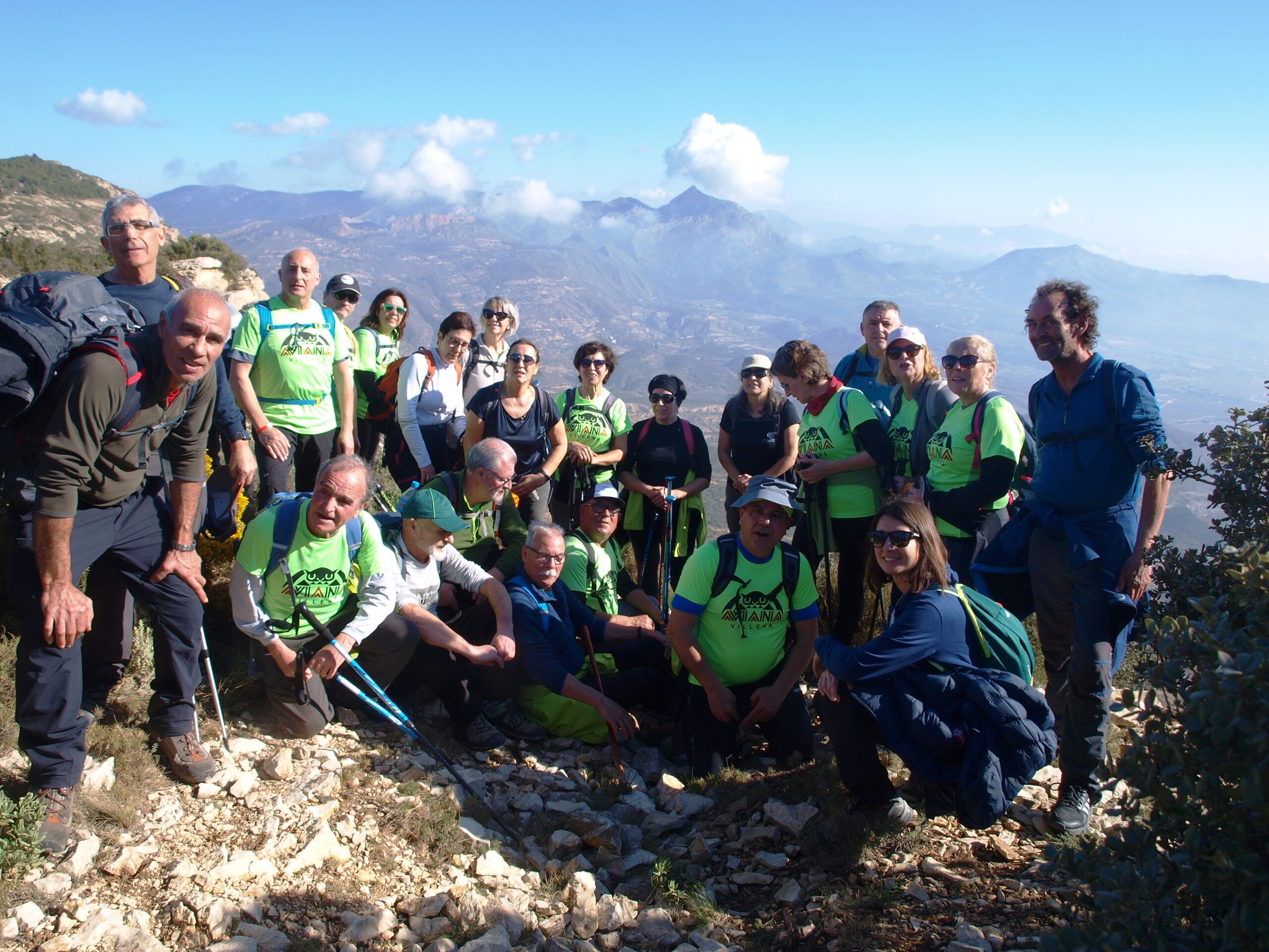 Después del almuerzo, continuamos la ruta ascendiendo en dirección al mirador del Cid, desde donde se tiene unas magníficas vistas del valle de Agost, de la costa alicantina, de los parajes del Rincón Bello y Xorret de Catí, así como de las diferentes sierras circundantes, el Maimó, el Derramador… A partir de aquí giramos a la izquierda, por una senda que recorre toda la crestería en dirección a la Silla del Cid. Este tramo, en algunos momentos algo expuesto, obliga a extremar los sentidos, nos permite seguir contemplando unas espectaculares vistas, ya que discurre por una pared rocosa que se elevada sobre el valle más de 300 m. Siguiendo este sendero llegamos hasta el collado del Contador, donde girando a la izquierda tomando una senda que discurriendo a los pies de las formaciones rocosas de la cara sur de la silla de Cid nos condujo a nuestro punto de