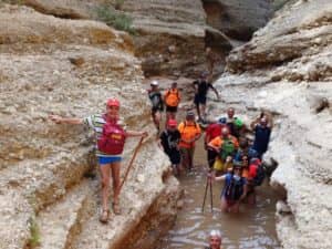 Posteriormente, la ruta continua por el rio Chícamo, afluente del rio Segura, se trata de un río de características semiáridas, que discurre mayoritariamente por una cuenca de naturaleza margosa formando un conjunto de charcas. Avisados por el guía de que teníamos que cruzar el río en numerosas ocasiones, nos preparamos cambiando las botas de montaña por las sandalias de agua o escarpines y los pantalones por los bañadores. En algunos tramos el agua nos llegaba hasta la cintura, permitiendo que los más atrevidos se pudieran dar un chapuzón, ya que el agua no estaba excesivamente fría. Siendo éste un tramo de aventura y diversión.
