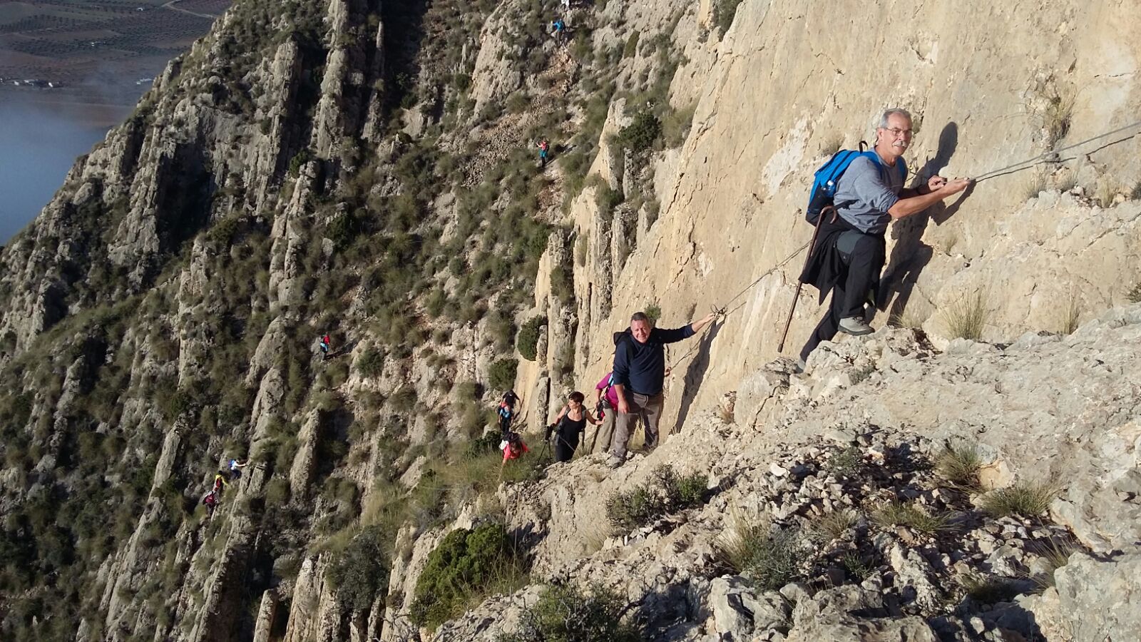 Una vez dejamos los coches y comenzamos a subir la montaña, con sus 1.088 metros de altura es considerada la segunda montaña más alta de Jumilla después del Carche. Vamos dejando la niebla atrás y empiezan a aparecer unas vistas espectaculares con fuertes pendientes y acantilados a ambos lados que la hace impresionante. A nuestro paso observamos que la montaña está cubierta por matorral de esparto y algunos restos de encinar en la zona más alta.