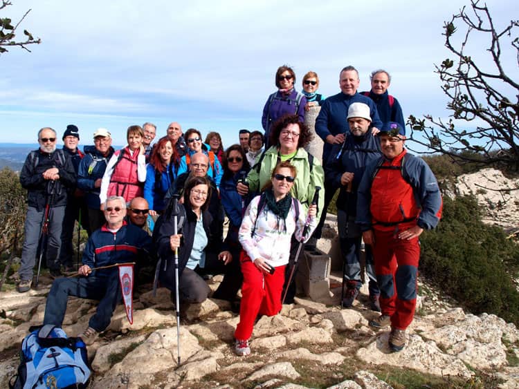 Desde el puerto de la Carrasqueta nos dirigimos hacia el este, por toda la crestería de la sierra, visitando en primer lugar el nevero del “Pou del Surdo” donde hicimos una primera parada, observando todo el valle de Jijona y las sierras colindantes – El Cap D´or y la peña Miglior – así como la bahía de Alicante. Continuamos entre pistas y senderos, subiendo y bajando, sin grandes pendientes, hasta alcanzar el punto geodésico del pico “Els Plans” de 1331 m. situado en una formación rocosa de plástica belleza, donde hicimos una parada para almorzar y contemplar los amplios paisajes que lo circundan, desde la Mariola hasta el mar, así como el devastador incendio que hace unos años asoló los alrededores de Torremanzanas.