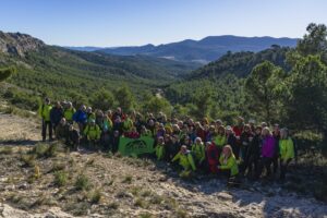 Aparcamos en el camino asfaltado que está junto a la zona de escalada y comenzamos la ruta por la falda norte pasando cerca de “L’Aigüeta de Silvio”. Siguiendo la pista “Revolcador”, ascendemos por una fuerte pendiente entre pinos y vegetación de monte bajo (romero, coscoja, lentisco, brezo, aliaga, esparto…), hasta alcanzar el punto PR-CV 155 donde paramos a almorzar. Mientras reponemos fuerzas, disfrutamos de un agradable sol que calienta el cuerpo y el alma y contemplamos una vista espectacular de la sierra La Argueña.
