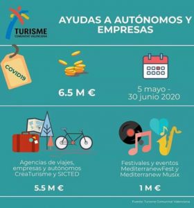 Se trata de ayudas de 2.500 euros para las personas obligadas a la suspensión de actividades por el Real Decreto 463/2020. Podrán beneficiarse las entidades adheridas a los programas CreaTurisme, Mediterranew Fest y Musix o SICTED. La presentación de la solicitud se realizará desde la Sede Electrónica de la Generalitat, apartado ‘Servicios on-line’, a partir del día 5 de mayo de 2020. Pulsa aquí para consultar la versión completa |