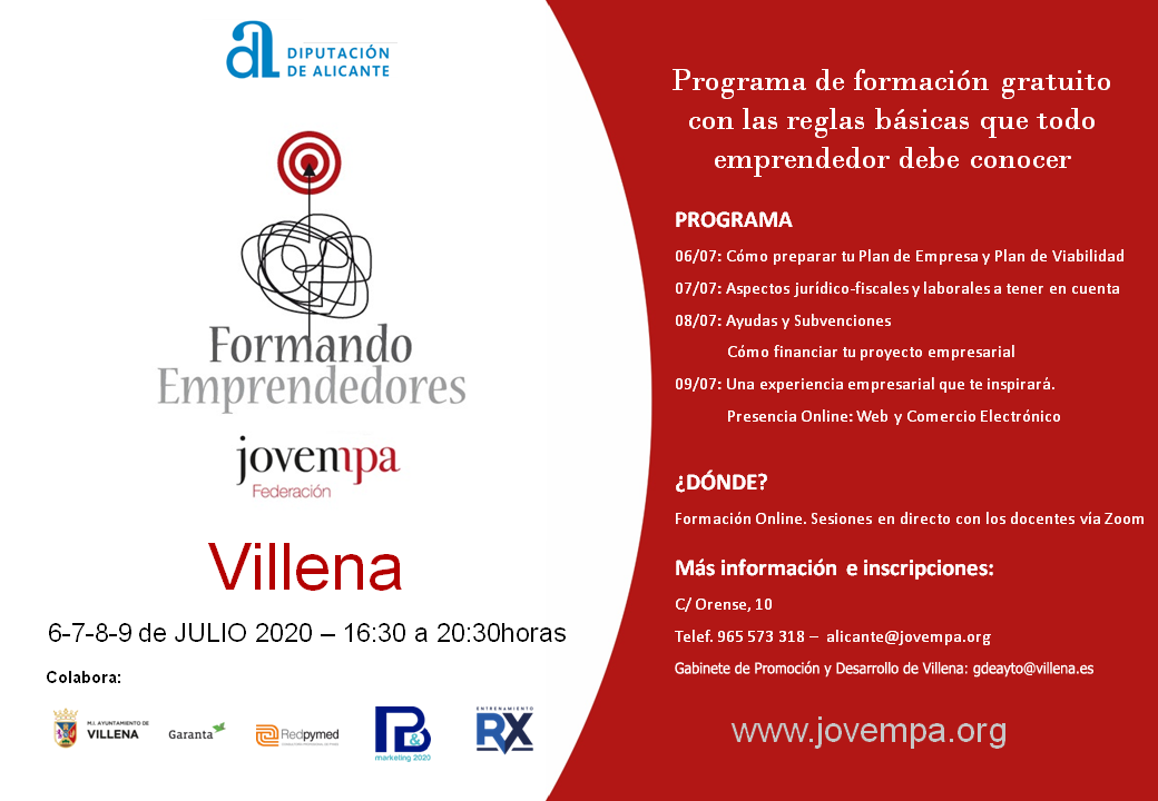 El Gabinete de Promoción y Desarrollo y JOVEMPA traen de nuevo a Villena el curso gratuito de formación para personas emprendedoras el cual este año se realizará de forma online durante el mes de julio.