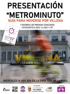 La Concejalía de Movilidad Urbana y la entidad Villena en Bici presentarán el próximo miércoles, 16 de noviembre, ‘Metrominuto’, una guía sobre desplazamientos rápidos en el casco urbano a pie o en bicicleta que permiten llegar antes al destino que en vehículos a motor. Este trabajo, que ha sido desarrollado por el colectivo Villena en Bici, pretende sensibilizar sobre el actual abuso del coche por desconocimiento de otras alternativas que pueden ser más rápidas, más seguras, menos contaminantes y más baratas.