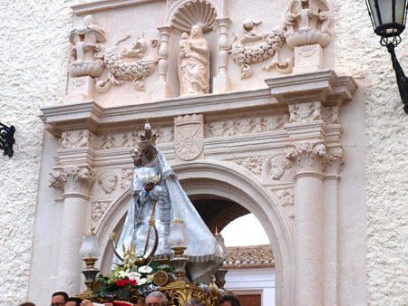 Situada sobre un acceso escalonado mediante ocho gradas de sillería, la portada se compone de un arco de medio punto entre medias columnas de fuste liso y capitel compuesto con querubines entre las volutas y con sendas láureas clásicas y motivos vegetales en el extradós.- También se pueden apreciar con detalles, las molduras, cornisas, relieves de niños, el escudo de Villena, así como la hornacina central que cobija una singular escultura de la Virgen entre balaustres y rematada por una concha flanqueada por sartas de granadas y jarrones con piñas.-