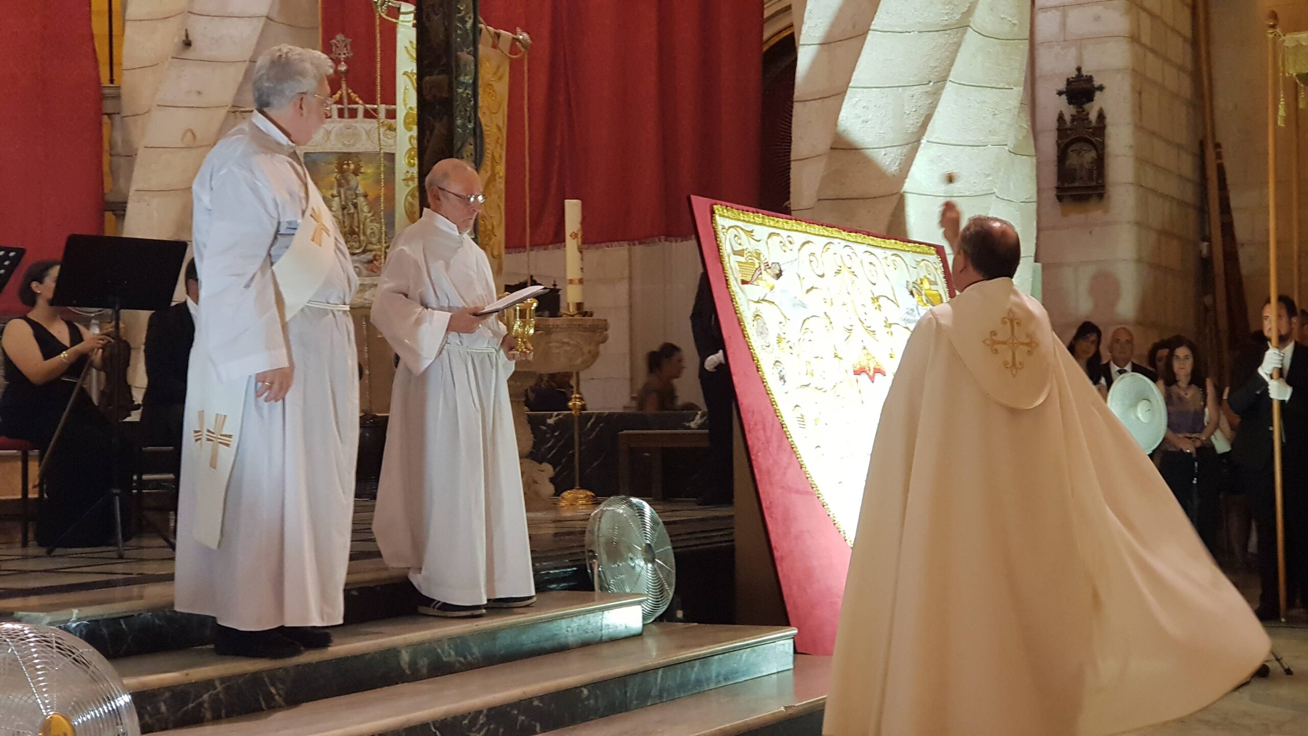 En una abarrotada iglesia Arcedianal de Santiago con la asistencia del diputado nacional, Pedro Rodríguez , la diputada autonómica, Ana María Cerdán, concejales, presidentes y presidentas de coamparsas, el presidente de la Junta Central de Fiestas y las Regidoras,  el párroco Reyes Rodríguez ha procedido a la bendición del nuevo manto de la Virgen, Nuestra Señora de las Virtudes, el “Manto de Fiestas”, el nuevo estandarte y el palio, con el que procesionará la Patrona el próximo 8 de septiembre. Al son del pasodoble de “La Morenica” de Manuel Carrascosa, se desplegaron las telas que tapaban el nuevo manto de la Virgen para que los fieles pudiesen contemplar el nuevo conjunto textil de la Virgen.