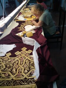 Este año el primer día tiene un acontecimiento especial, la bendición de la túnica que han bordado en su taller un@s voluntari@s que dedicaban las tardes de los domingos a pasar un rato con la aguja, los hilos y su “saber hacer”, allí estuvieron Tere, Adela, Mª Ángeles, Mª del Prado, Virtudes, Consuelo, Francisca, Gregorio, Mª Jesús, Miguel Ángel, Toribio, Virtudes, bajo la dirección y diseño de Simón. Y el hecho del trabajo se convirtió en una distracción imprescindible para algun@s de l@s que pasaron por ese taller improvisado, era una obligación después de la comida familiar de los domingos, una condición para que no se alargara demasiado la sobremesa, una especial circunstancia para cambiar celebraciones de hijos y nietos, una excusa para preparar alguna tarta o buscar algunos chocolates para la merienda (la faena no está reñida con la comida),…era un gozo que iluminaba la cara de las personas que allí se juntaban.