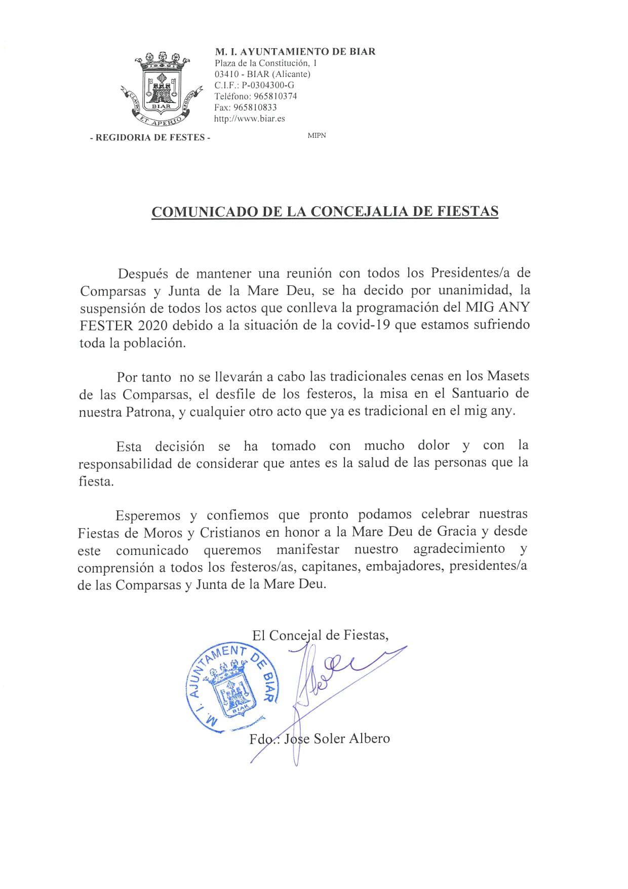 El Ayuntamiento de Biar ha agradecido, en un comunicado, la comprensión de todos los festeros, capitanes, embajadores, presidentes de las comparsas y la Junta de la Mare de Déu. Además, ha insistido en que “esperamos y confiamos que pronto podamos celebrar nuestras Fiestas de Moros y Cristianos en honor a la Mare de Déu de Gracia”.