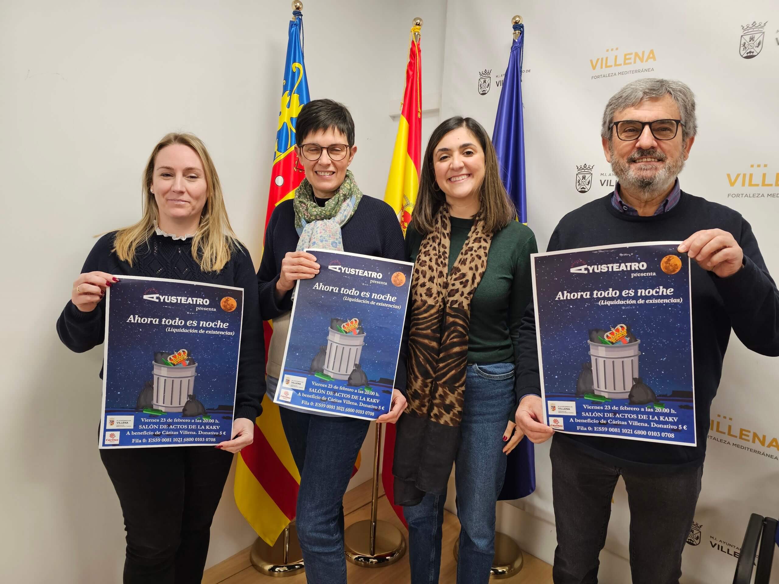 La Concejalía de Bienestar Social y Cáritas Villena han programado la representación de la obra teatral ‘Ahora todo es noche, hasta la liquidación de existencias“, en beneficio a la entidad social para atender los problemas de las personas sin hogar, según ha comentado hoy la edil del área, Alba Laserna.  La representación tendrá lugar el próximo 23 de febrero a las 20.00 horas en la Casa de la Cultura con una entrada aportación de cinco euros, destinada íntegramente a Cáritas.