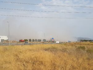 Más de una decena de bomberos se encuentran en estos momentos trabajando para sofocar un incendio de matorral en un área grande en el campo yermo. El fuego se iniciaba casi a las 18 horas junto a la autovía A-31 entre Sax y Villena a la altura de la vía de servicio situada frente a La Colonia de Santa Eulalia.