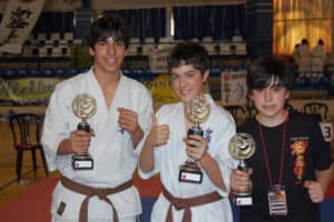 Categoría infantil masculino. 3º, Victor Zapater (Kata). 5º, Christian Navarro (Kumite). 8º, Jorge Domene (Kata).