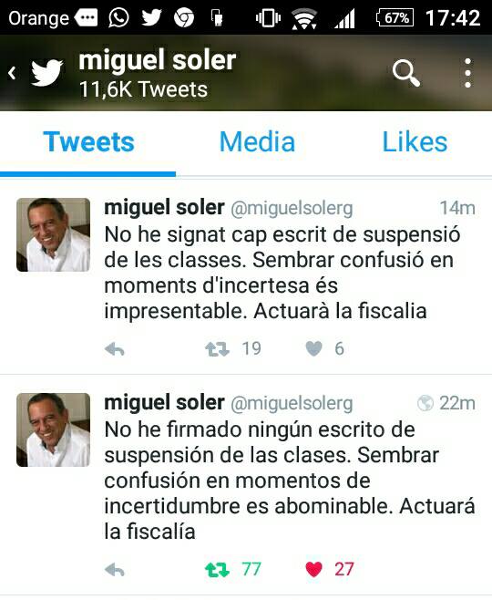 El conseller de Educación Vicent Marzá ha asegurado que hoy a las 20:30 se lanzará un comunicado donde se indicarán que colegios cerrarán las puertas. Por ahora, sólo faltarán a clase los niños de los municipios de Bajo Segura. Asimismo, Miguel Soler, secretario autonómico de la conselleria de Educación , afirmó en su twitter que no ha firmado ningún escrito de suspensión de clases.