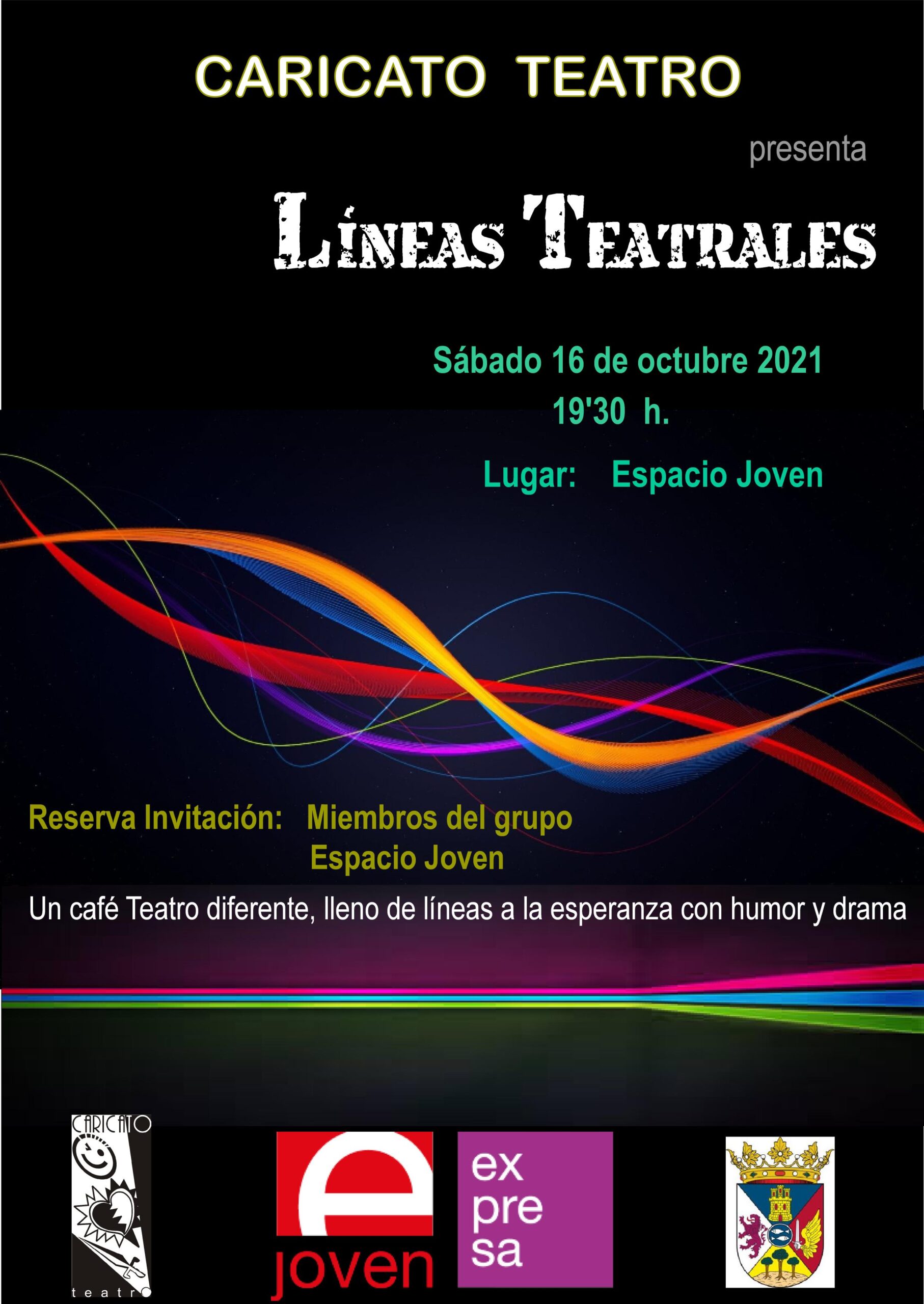 Comienza la temporada y un año más EL ESPACIO JOVEN acoge una actividad teatral que llevará a cabo el grupo local CARICATO TEATRO. Como va siendo habitual, se trata de un Café Teatro. En él participarán un total de 14 actores y actrices, en un espectáculo denominado “LÍNEAS TEATRALES”.