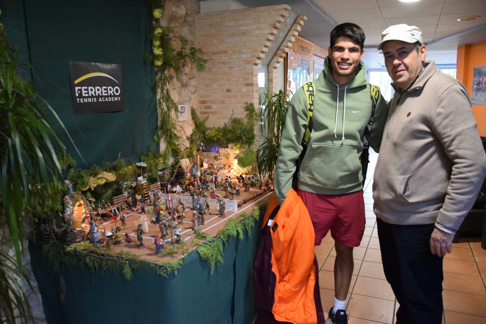 El tenista Carlos Alcaraz ha contemplado el belén recreado en una pista de tenis y que se exhibe en la Academia Equelite Juan Carlos Ferrero de Villena. Carlos Alcaraz ha podido intercambiar impresiones con el autor de dicho belén, José Antonio Serrano.