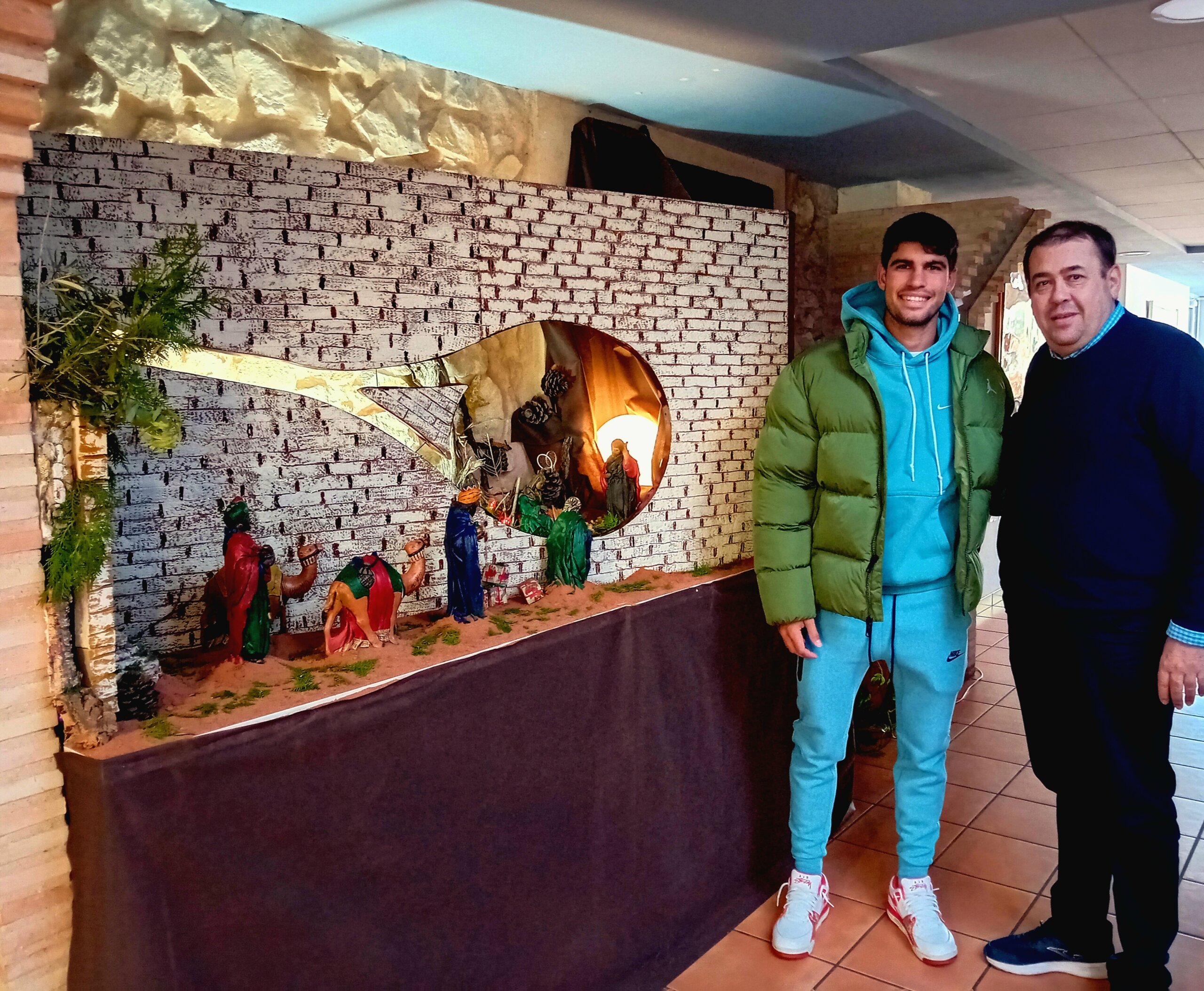 Visita tradicional del tenista Carlos Alcaraz al Belén de Equelite, basado en una gigantesca raqueta de tenis.