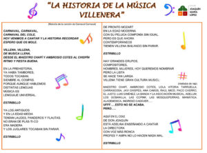 Pero lo más característico y el motivo de dirigirnos a ustedes es que se ha adaptado una letra a la melodía de la típica canción de “Carnaval Carnaval”, en la que hablamos del paso de la historia, pero sobre todo hacemos mención de la riqueza musical en Villena y nombramos a hombres y mujeres de nuestra ciudad que componen, que tocan y cantan. Se titula “LA HISTORIA DE LA MÚSICA VILLENERA”.