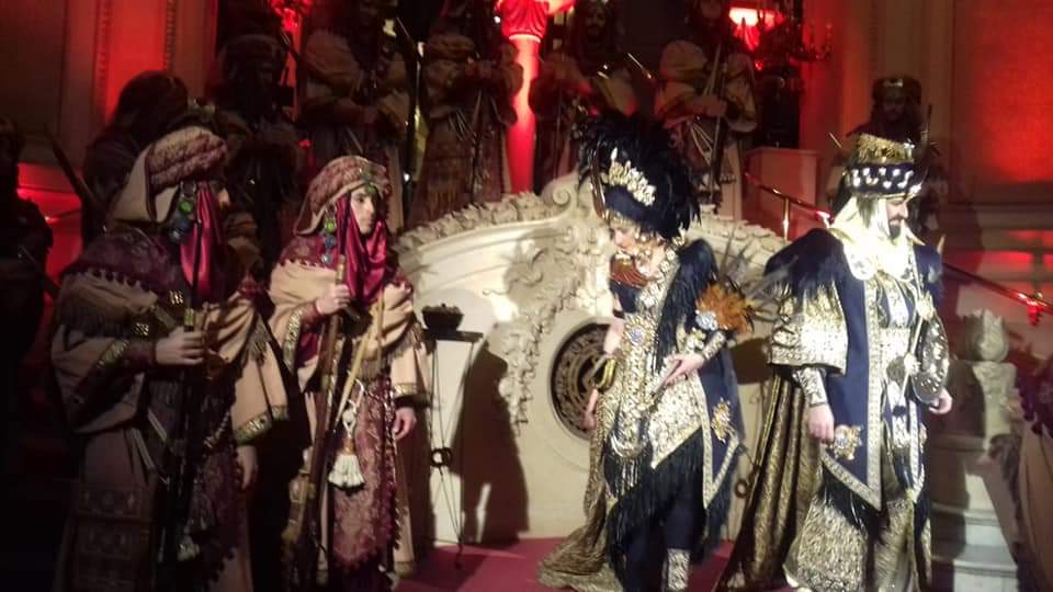 En la entrada del edificio se recreó una escena para recibir a los invitados, con vestuario de la empresa Abassies de los Moros y Cristianos de Villena y atrezzo de Mateos.